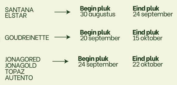 *Bij Goudreinette en Autento vallen bij rijpheid de appelen van de bomen. Pluk daarom de eerste keer rond het geadviseerde tijdstip. Natuurlijk mag je de vruchten die van de boom gevallen zijn gewoon meenemen. Deze zijn uitstekend te gebruiken in moes of appeltaart.